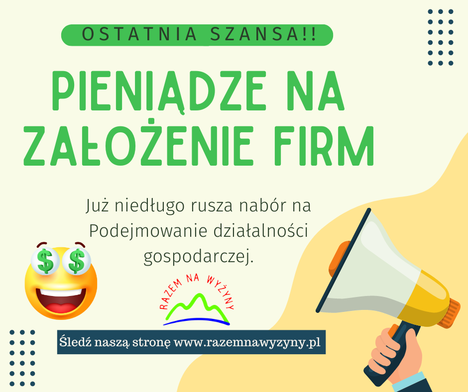 Osoby zainteresowane złożeniem wniosku w konkursie zachęcamy do zapoznania się z informacjami zawartymi na stronie https://razemnawyzyny.pl/konkursy/zakladanie-dzialalnosci-gospodarczej/