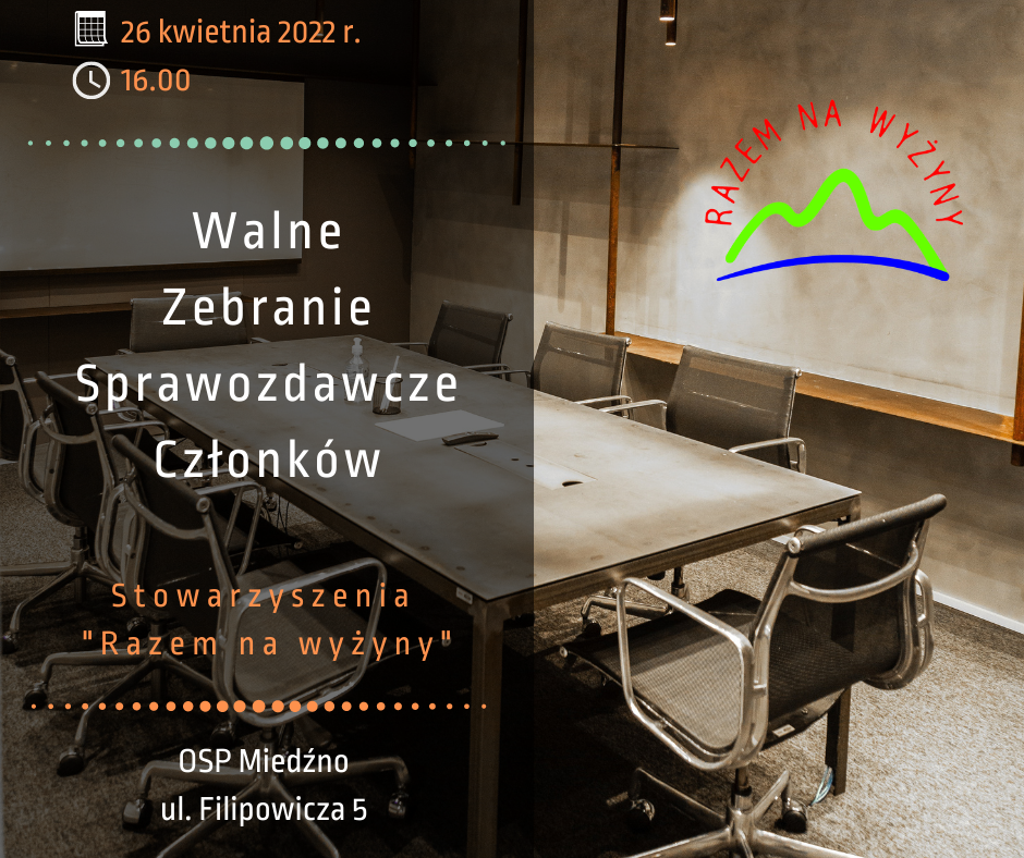 Zarząd Stowarzyszenia „Razem na wyżyny” z siedzibą w Mykanowie zgodnie z przepisami § 20 ust. 2 i 5 Statutu Stowarzyszenia zwołuje na dzień 26 kwietnia 2022 r. (wtorek) na godzinę 16:00 w Sali Ochotniczej Straży Pożarnej w Miedźnie ul. Filipowicza 5